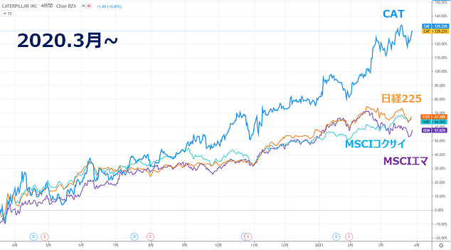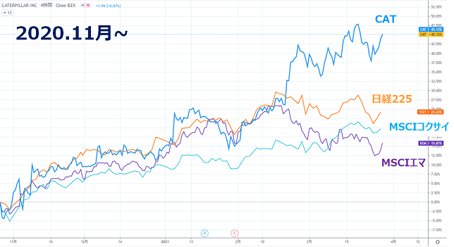 2) どんなに少なくてもあと1~2年ぐらいは、米経済対策の恩恵を受けシクリカルは最も強含むはず。インフラ投資や鉱業、住宅需要を考えると、キャタピラーは成長が期待されますし、実際すべてのインデックスをアウトパフォームしているため、引き続き全体のパフォーマンス引き上げに貢献してくれるのではないかと考えました。