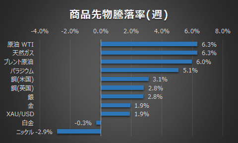 商品も概ね上昇しました。原油はOPEC、IEAともに今年の原油需要見通しを上方修正したことや米国の原油在庫の減少も後押しし堅調に推移しました。