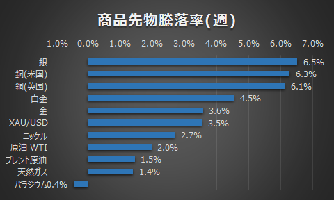 商品はリスク選好度の高い銀が上昇し4月からの上昇トレンドを継続しました。
