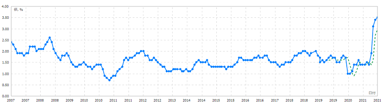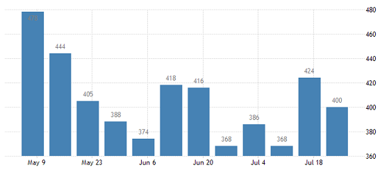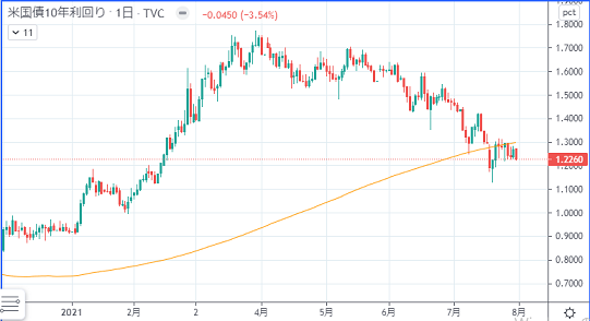 週の新規失業保険申請件数もやっと40万人と、40万人を境にふらふらしている状況です。この辺は9月以降の失業者支援策の失効まで大きく動かないのかもしれませんし、そうなると来月のジャクソンホールでのテーパリングの発声が無い可能性も浮上してくると考えています。