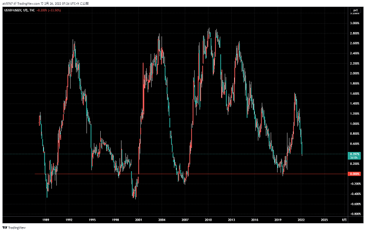 事実を追いかけていくと、昨日発表されたPCEデフレーターは6.1%と前回(5.8%)、予想(6.0%)のいずれも上回りました。原油価格も今週は一時100ドルを突破し、天然ガスも2014年の高値水準にタッチしました。短期金利は1.6%を中心に高止まり、長短金利差は一時0.3%前半まで縮まりましたし、チャートを見ると逆イールドは今年前半に起こるようにも捉えられます。