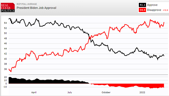 金利と商品価格の水準を見る限り、FRBが利上げのペースを緩めるとは考えにくいです。また大統領の支持率は昨年8月から低迷しており40%を切るのも時間の問題、インフレ高進に対して米政権への不信感もさらに高まってくるでしょう。中間選挙は相当厳しい戦いになると思われます。(※黒が支持、赤が不支持)