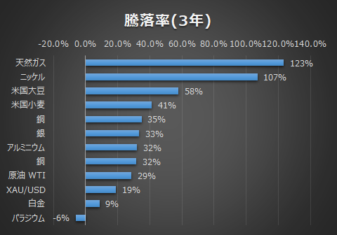 年末なので、各資産の1年間・3年間の騰落を参考までに掲載します。