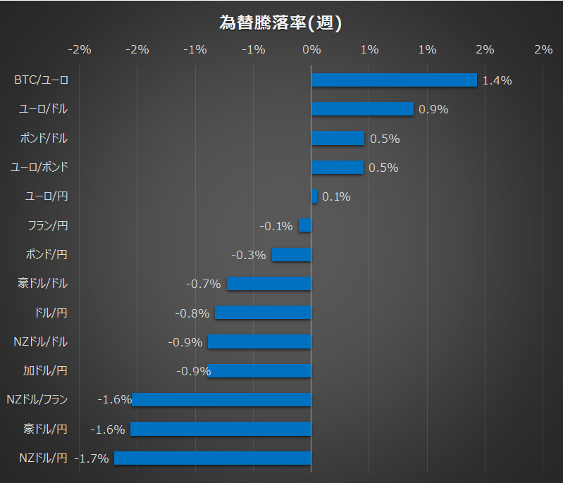 金利は全体的に低下も為替はクロス円・オセアニア通貨が特に弱く推移しましたが、一方仮想通貨は上昇、株も金利低下の影響か中国H株やナスダックなど、大型テックを中心に底固く推移しました。